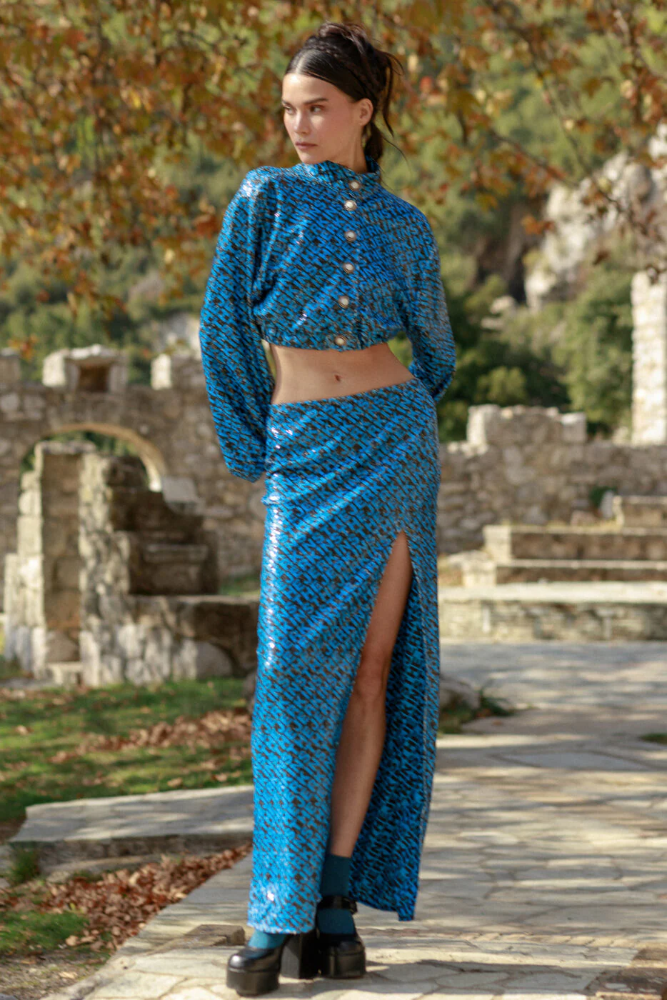 Stand out in this so special maxi skirt featured in a stunning sequined logo fabrication and a mid-rise style. Fitted silhouette and exaggerated front slit.