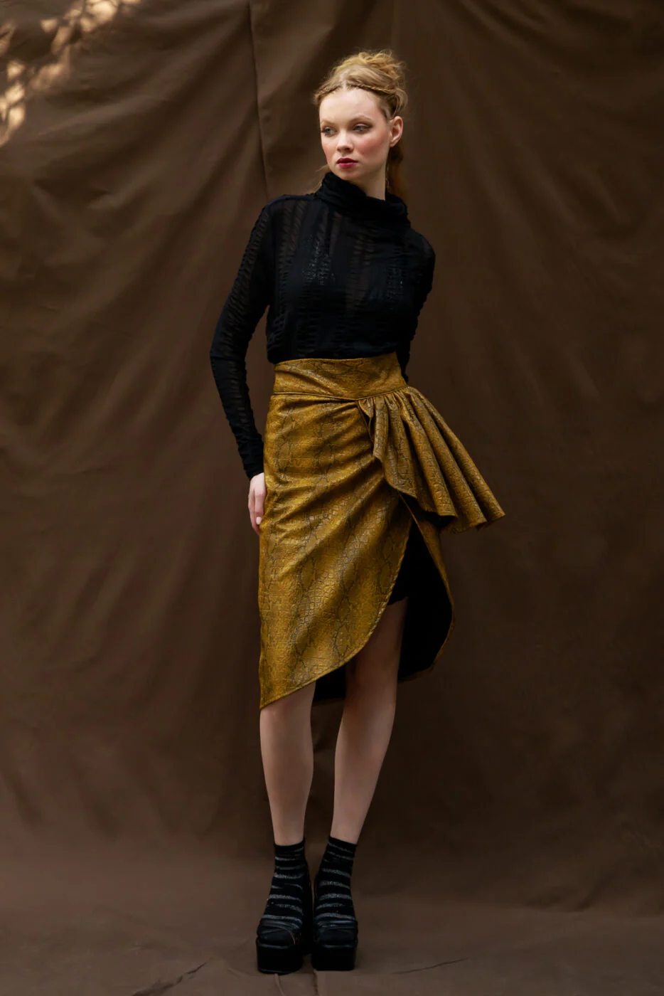 Geometric and statement-making, this faux-leather style is featured in a high-rise, midi, extra slim-fit silhouette with exaggerated ruffled detailing at the front for added shape. Back zip closure. Iconic and vintage inspired. Super slim fit in all sizes.