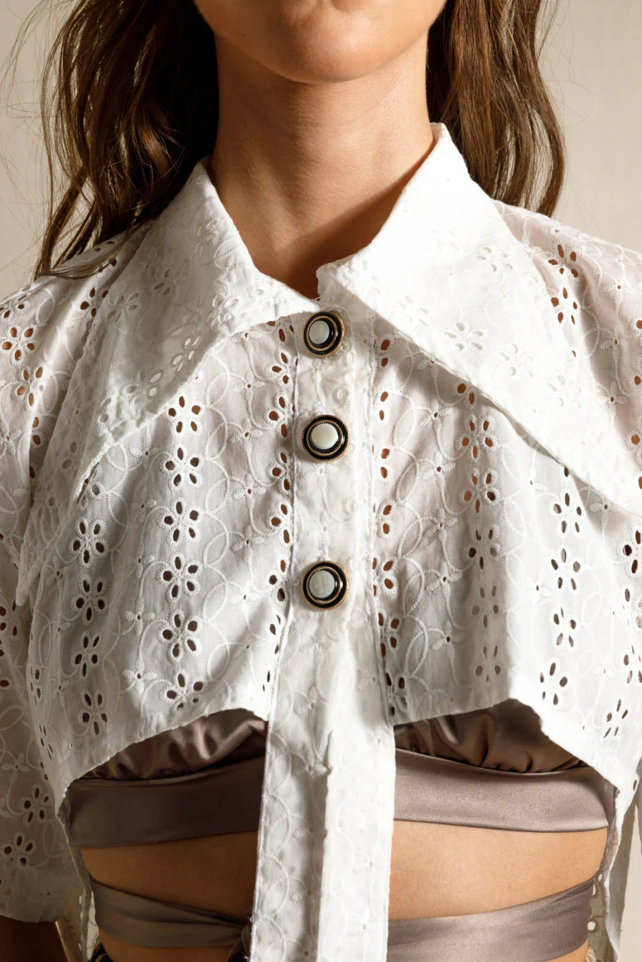 A contemporary touch on a forever classic, this cropped button-down shirt is featured in embroidered soft cotton fabrication. Staple boxy silhouette with exaggerated round back bottom hem and collar.
