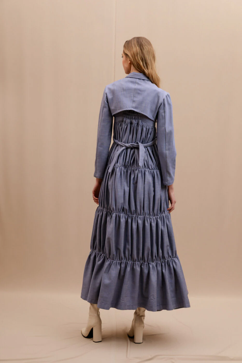 A contemporary take on the classic blazer, this so cool denim jacket is featured in a structured, cropped silhouette with exaggerated tie at bottom for added dimension.
