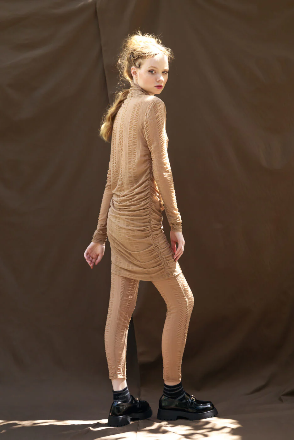 Turn heads in sheer and stunning top, featured in a high-neck silhouette with ruched detailing throughout. Slightly fitted body and long fitted sleeves.