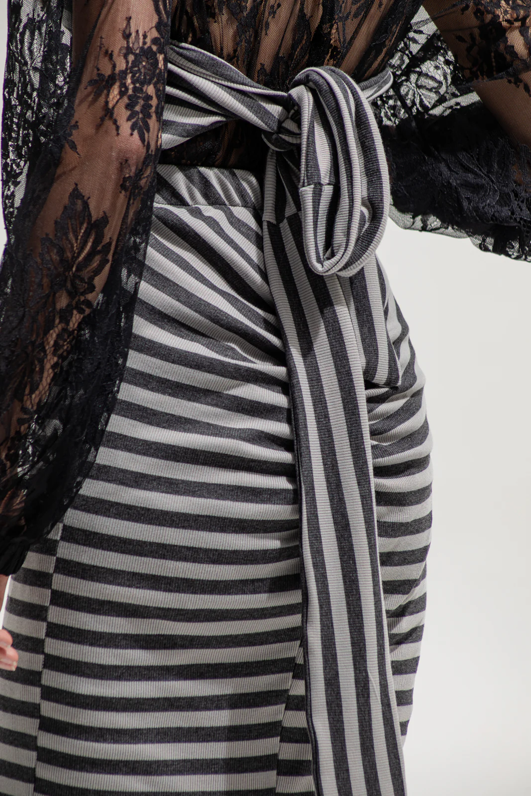 A versatile statement piece that moves between elegance and rebellion. This striped midi design can be worn both as a strapless dress or as a wrap skirt, featuring a wide self-tie belt that forms a dramatic bow at the back. Crafted from soft ribbed knit fabric in grey and black stripes, it hugs the body comfortably while maintaining its shape.