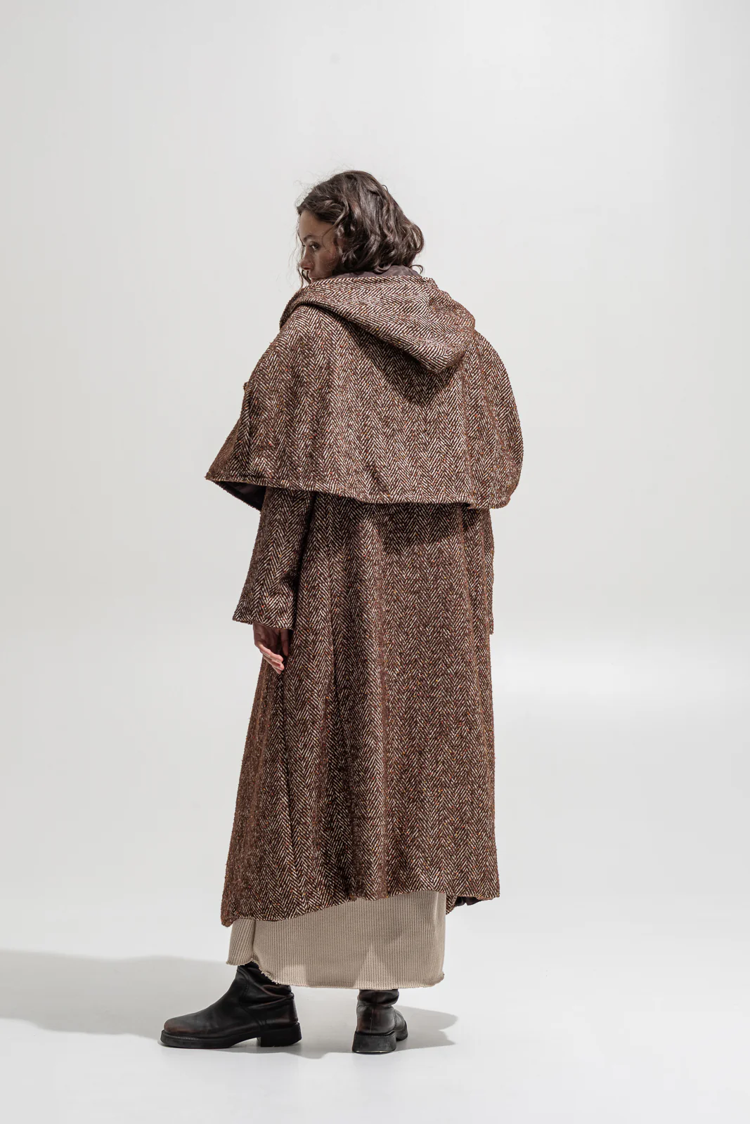A timeless piece reimagined with The Jerkinsā signature twist. Crafted from rich herringbone wool blend in warm brown tones, this long coat combines vintage tailoring with effortless edge. Featuring a dramatic oversized hood and cape-style overlay, it brings cinematic volume and structure to your winter wardrobe. The wide sleeves and relaxed fit allow for layering over chunky knits or dresses.