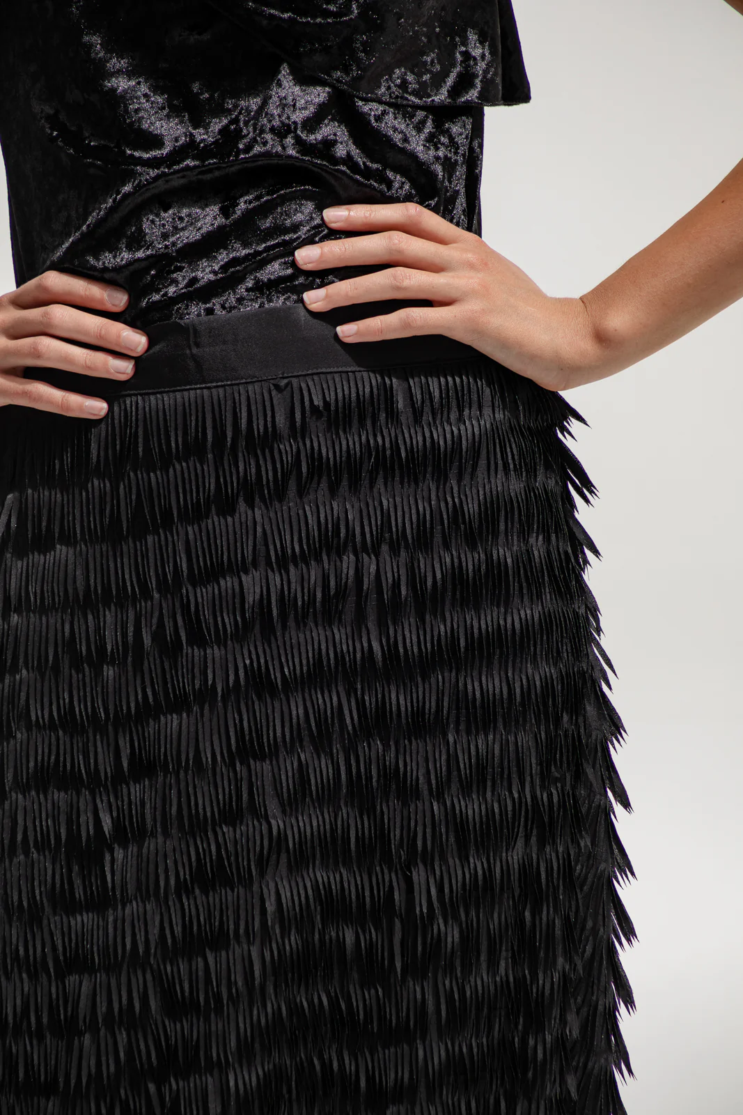 Timeless, fierce, and fluid. This black maxi skirt moves with intention — crafted in a textured pleated fabric that catches the light with every step. Its high-waisted fit elongates the silhouette, while the layered pleats add depth and rhythm. A statement piece that pairs effortlessly with velvet tops, corsets, or sharp blazers for evening or occasion looks.