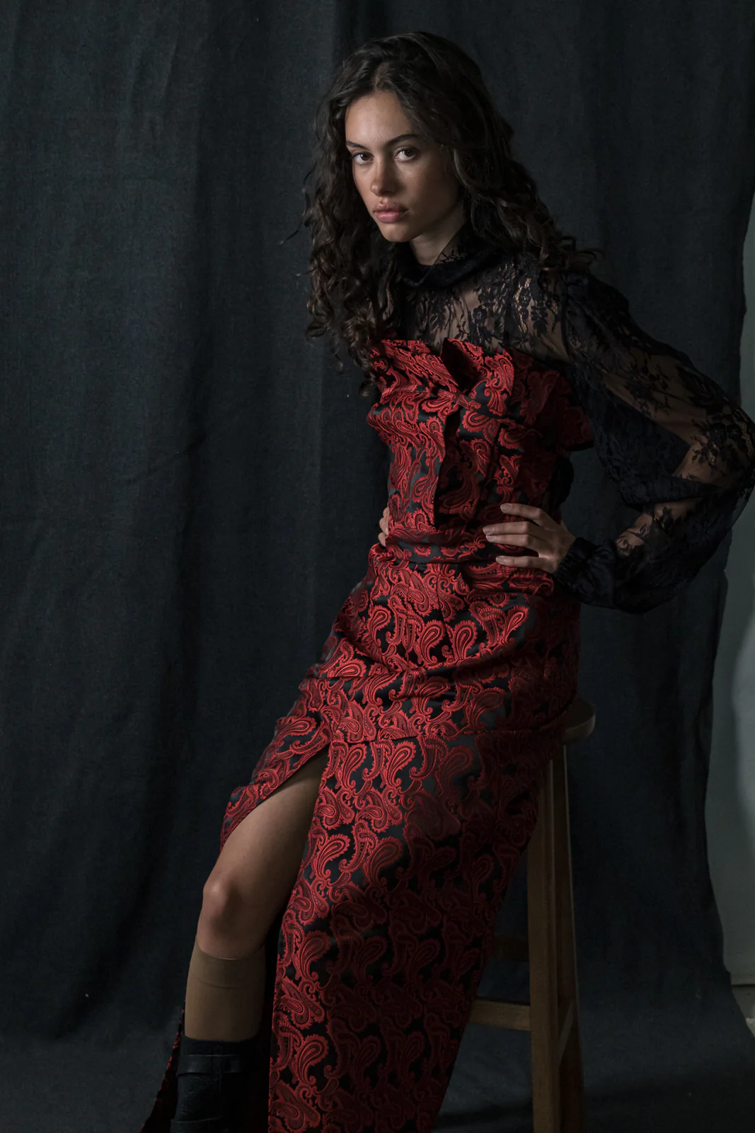 Made from heavy jacquard fabric in deep red and black paisley, this long dress sculpts the silhouette while catching the light with every step.
