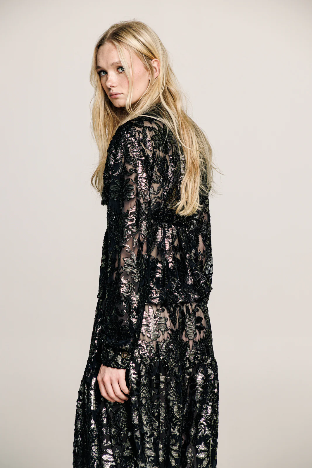 A sheer, statement-making shirt designed to captivate. Crafted from richly embroidered black lace with gold metallic accents, it features a deep V neckline and a tie-front closure that adds an effortless sensuality. The fluid drape and soft volume of the sleeves create movement with every step, while the intricate texture elevates it into a true night-out piece. Feminine, dramatic and unmistakably Jerkins.