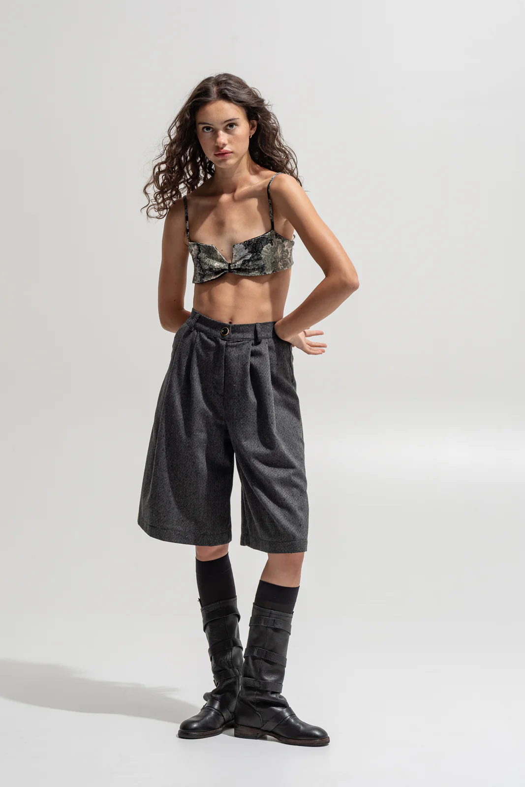Step into the spotlight with this bold sequined bralette — a statement piece crafted to elevate any look. Designed in our signature floral sequin fabric, it catches the light beautifully while offering a structured, modern silhouette. The clean V-cut front and delicate straps create a sleek, feminine shape, perfect for layering or wearing alone as a standout top.