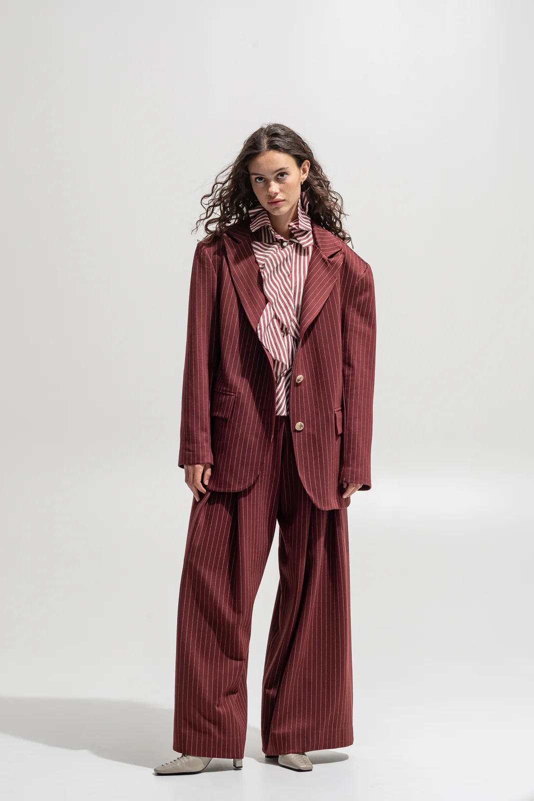 Redefine tailoring with this oversized pinstripe blazer in warm bordeaux tones. Crafted with a structured silhouette and sharp lapels, it features flap pockets, statement engraved buttons, and subtle vertical stripes that elongate the figure. Designed to blur the lines between masculine edge and feminine ease, it pairs perfectly with wide-leg trousers for a bold suit look, or over dresses and denim for effortless layering.