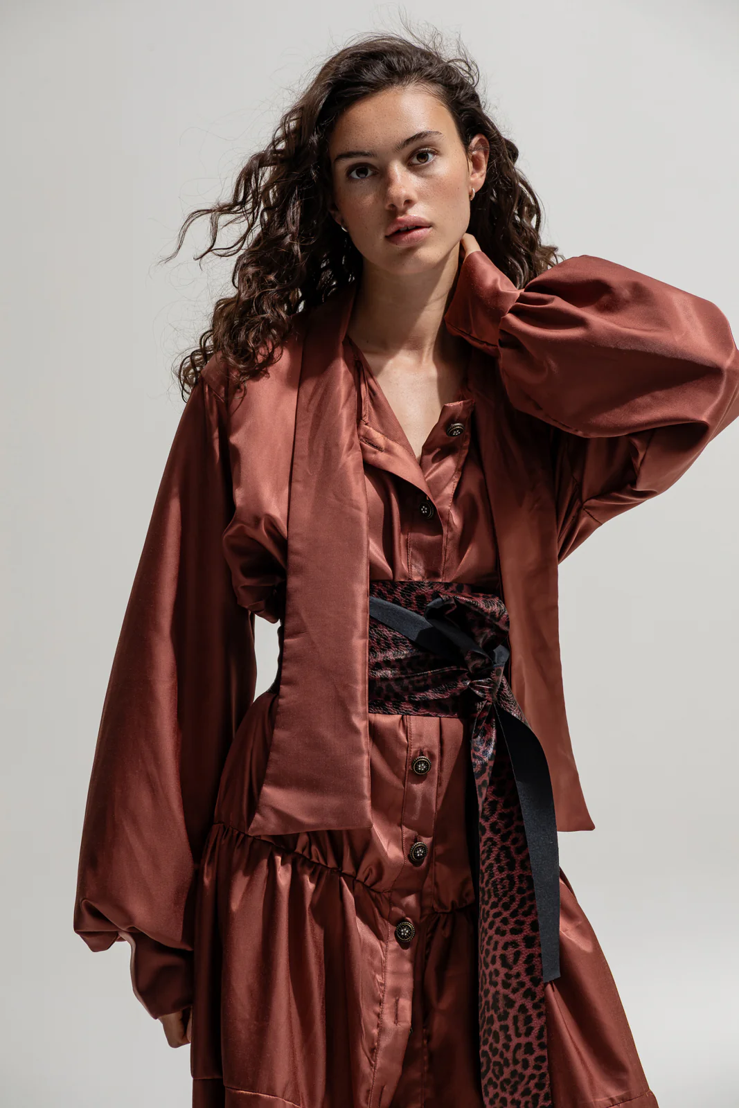 A statement belt designed to define the waist with attitude and sophistication. Crafted from soft eco-leather with a rich animal-textured finish, it wraps effortlessly around the body and ties into a bow or knot at the front. Perfect for layering over dresses, shirts, or outerwear — instantly elevating any look with a bold, feminine edge.