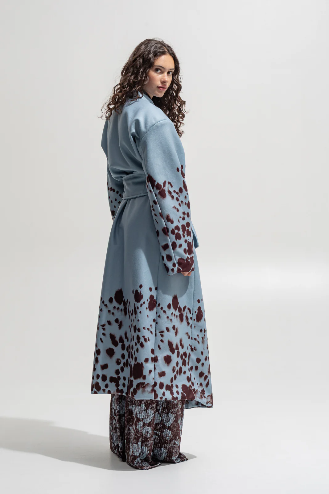 Crafted from smooth wool-blend fabric in powder blue tones, this oversized coat features bold burgundy splash patterns that make each piece unique. Its fluid silhouette, wide lapels and matching belt wrap effortlessly around the body, blending softness with strength.