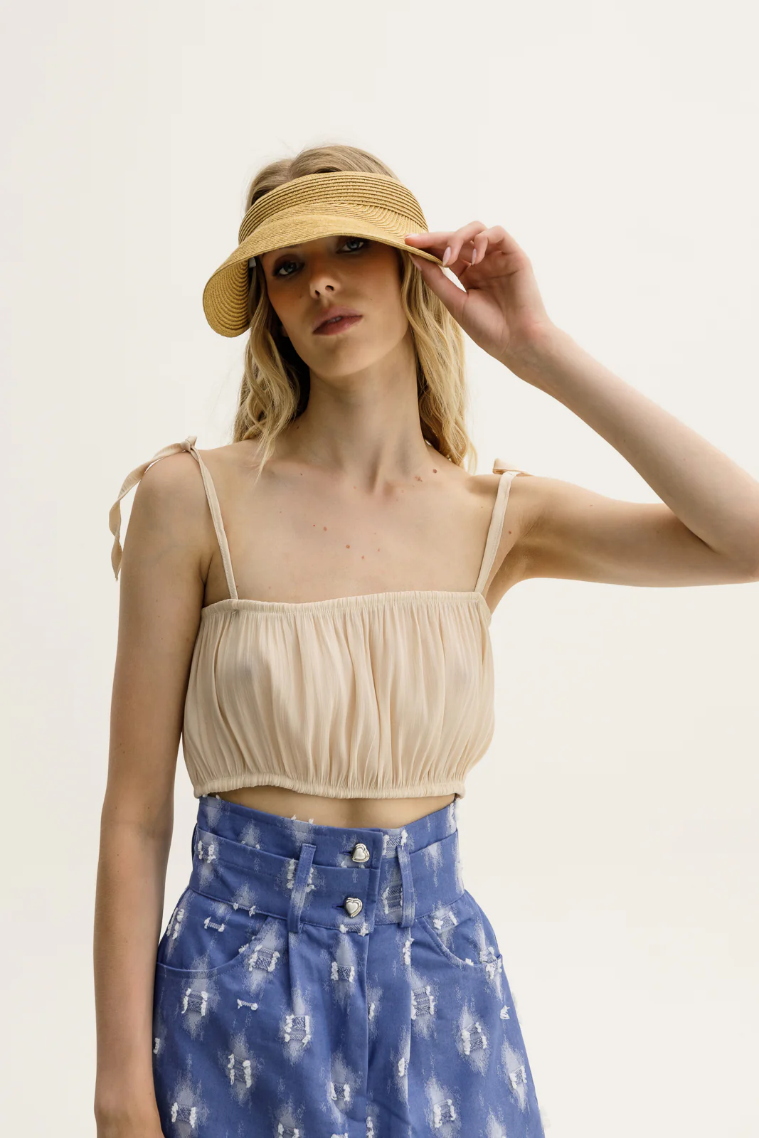 A breezy summer essential with a playful twist, this textured crop top is crafted from lightweight, crinkled fabric in a warm caramel tone. Featuring gathered elastic edges at the bust and hem for a softly voluminous silhouette, it ties at the shoulders for an adjustable, feminine fit. Perfect for pairing with high-waisted shorts, skirts, or trousers, it brings a laid-back yet elevated feel to your seasonal wardrobe.