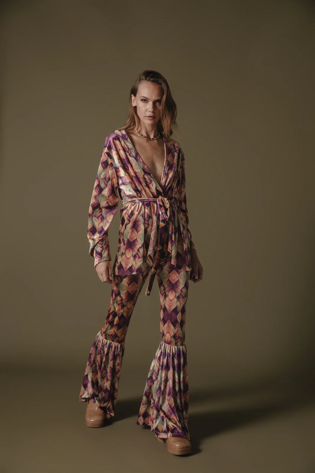 Upgrade your wardrobe with our Geometric Top, featuring a striking diamond print in soft, autumnal tones. This long-sleeve top boasts a flattering design with a self-tie belt, creating a chic silhouette. Its lightweight velvet fabric and deep V-neckline make it a versatile piece, perfect for both casual and evening looks. Pair it with matching pants for a bold, coordinated style!
