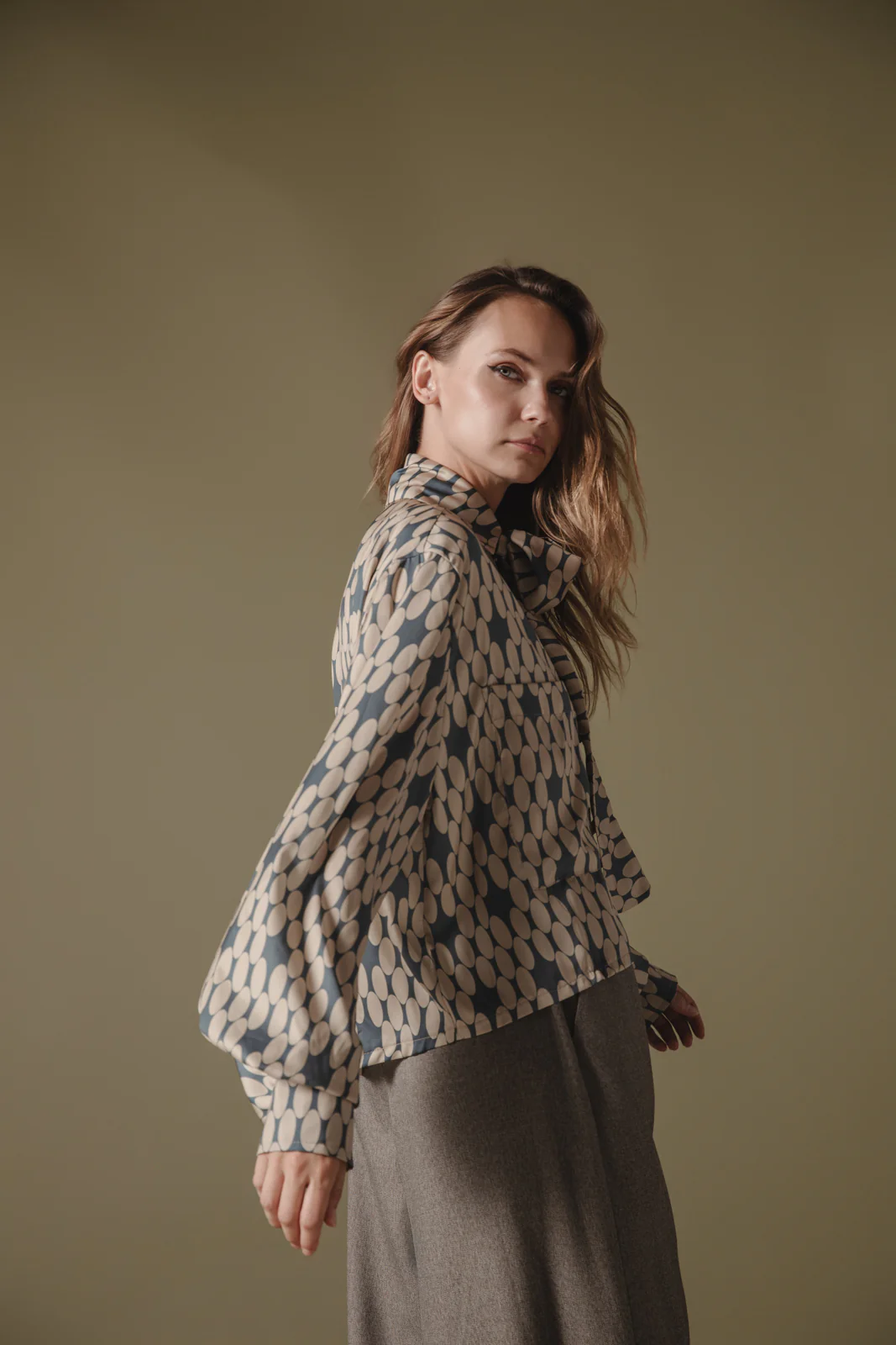 This stylish shirt features a retro-inspired polka dot print in neutral tones, making it both bold and versatile. Designed with a loose fit, it includes a chic necktie detail for added sophistication and buttons down the front. The balloon sleeves add volume and elegance, making it perfect for both professional and casual outfits. Ideal for those seeking a statement piece with a vintage flair.