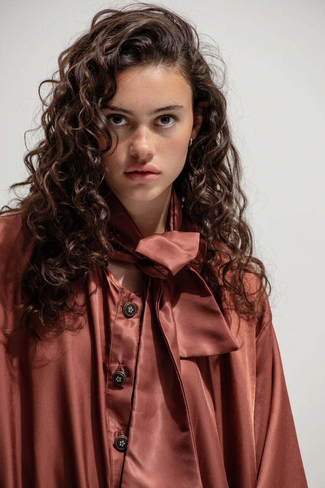 Step into effortless elegance with this statement satin maxi dress in a warm terracotta hue. Designed with a fluid silhouette, it features a button-down front, voluminous sleeves, and a flattering tiered structure that adds subtle movement. The standout bow-tie detail at the neckline brings a touch of sophistication and vintage charm, while the lustrous fabric enhances its luxurious feel.