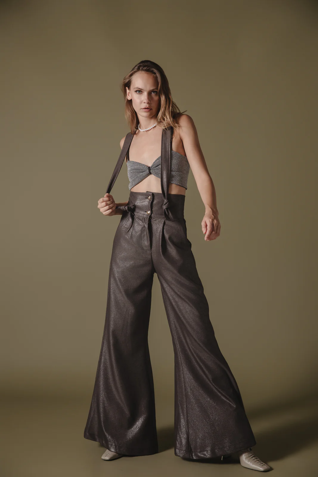 These high-waisted metallic wide-leg pants offer a bold, fashion-forward look. Featuring statement suspenders and a buttoned front, they bring a touch of modern sophistication to any outfit. The shimmering fabric and relaxed silhouette make them perfect for both day and evening wear, combining comfort with style. Pair them with a fitted top to emphasize the dramatic volume of the trousers for a striking ensemble.