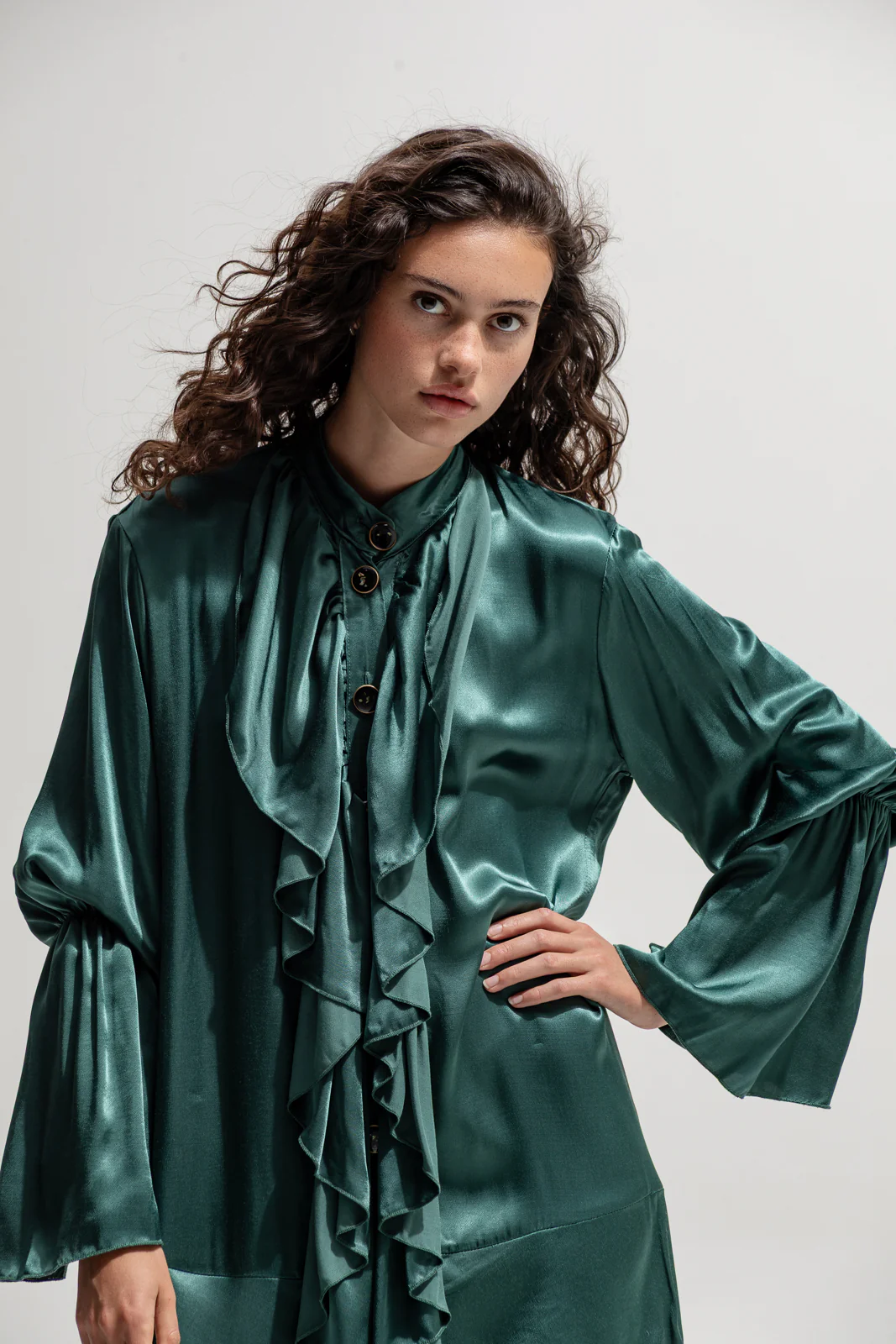Channel timeless elegance with this emerald satin maxi dress, designed in a flowing silhouette that moves with ease. Crafted from lustrous satin, it features dramatic ruffle detailing cascading down the front, a high neckline with statement buttons, and voluminous sleeves gathered at the cuffs for a romantic touch. The detachable waist belt allows for a defined fit, giving versatility to the styling.